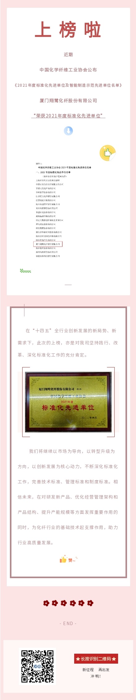 翔鷺化纖榮獲2021年度中國化學(xué)纖維工業(yè)協(xié)會(huì)標(biāo)準(zhǔn)化先進(jìn)單位